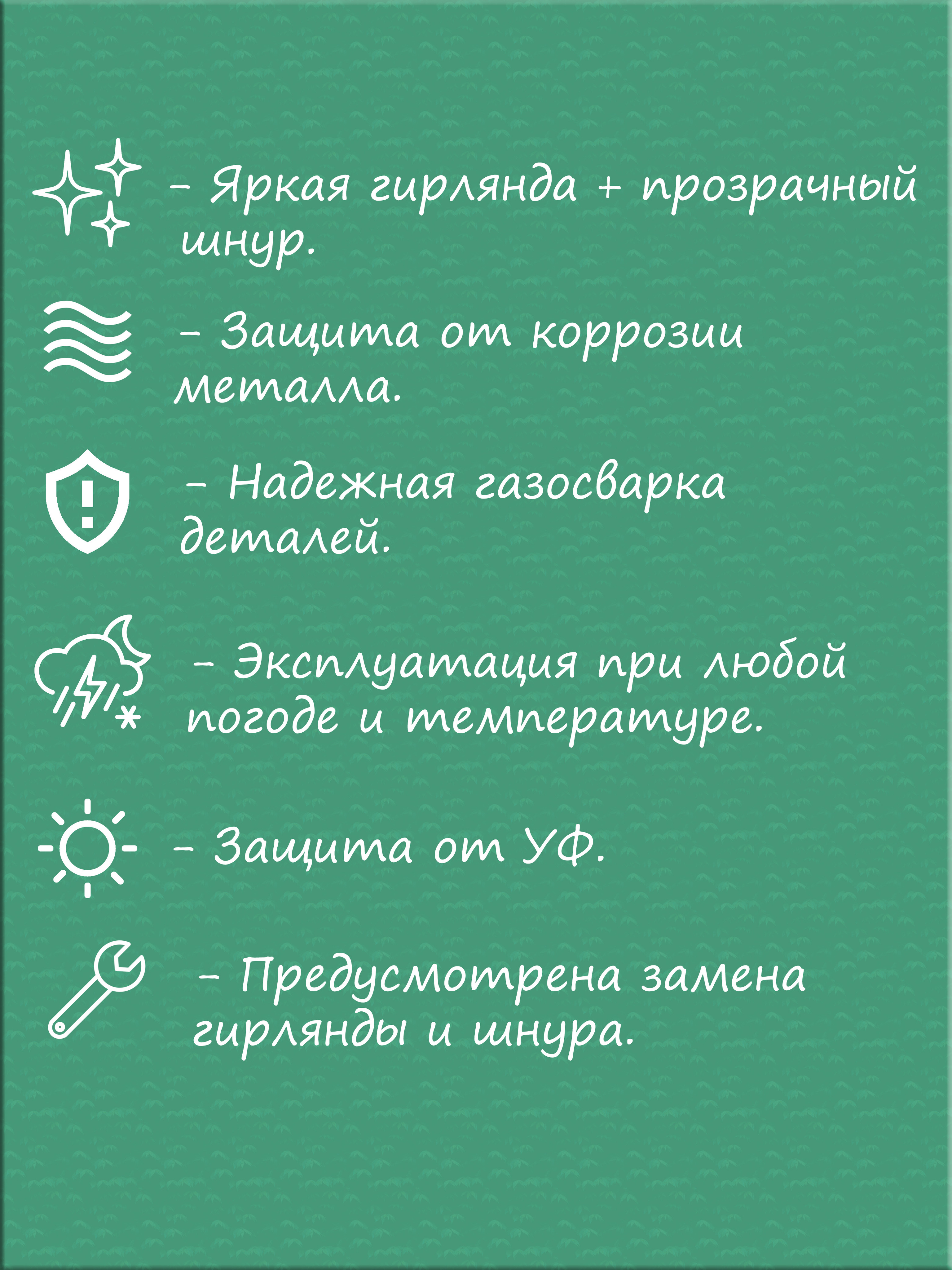 Световые фигуры-это оригинальное и яркое украшение для общественных мест и частных территорий.Они эффектно смотрятся и привлекают внимание,создают атмосферу сказки и праздника.Основой изделий служит металлический каркас из проволоки,покрытый антикоррозийными краской и лаком,оплетается прозрачным шнуром и светодиодной гирляндой,которая безопасна в использовании и потребляет мало электроэнергии.