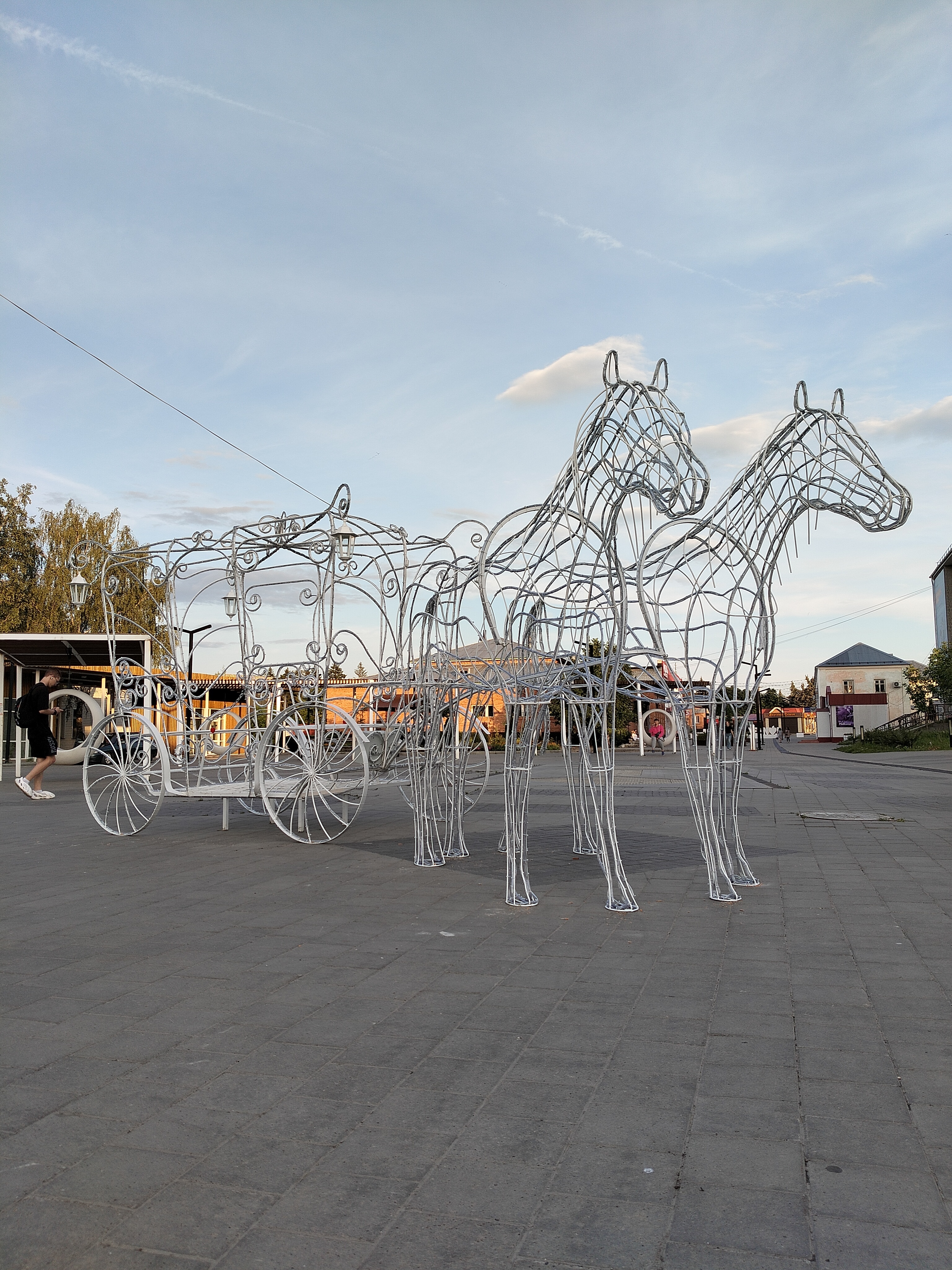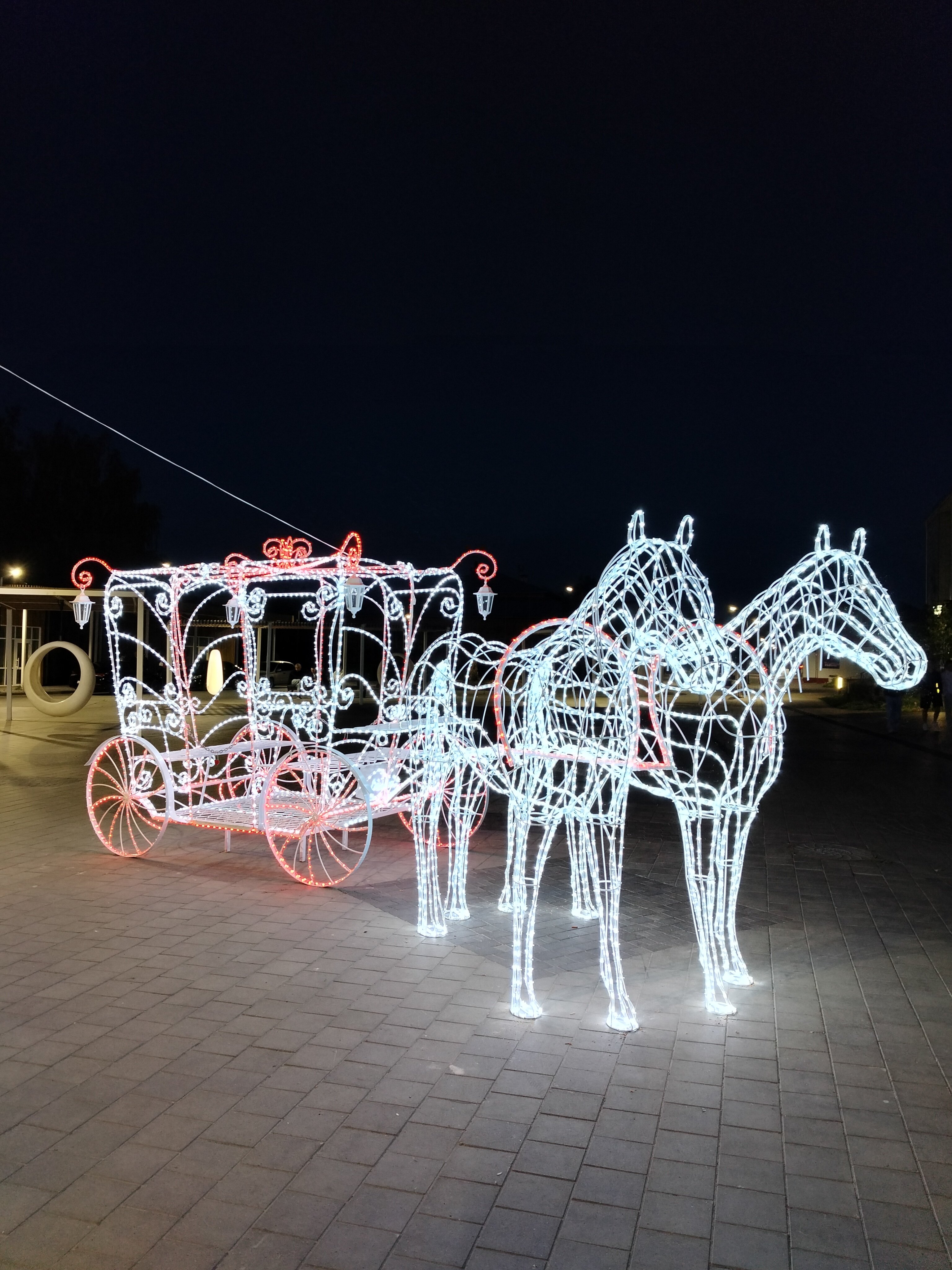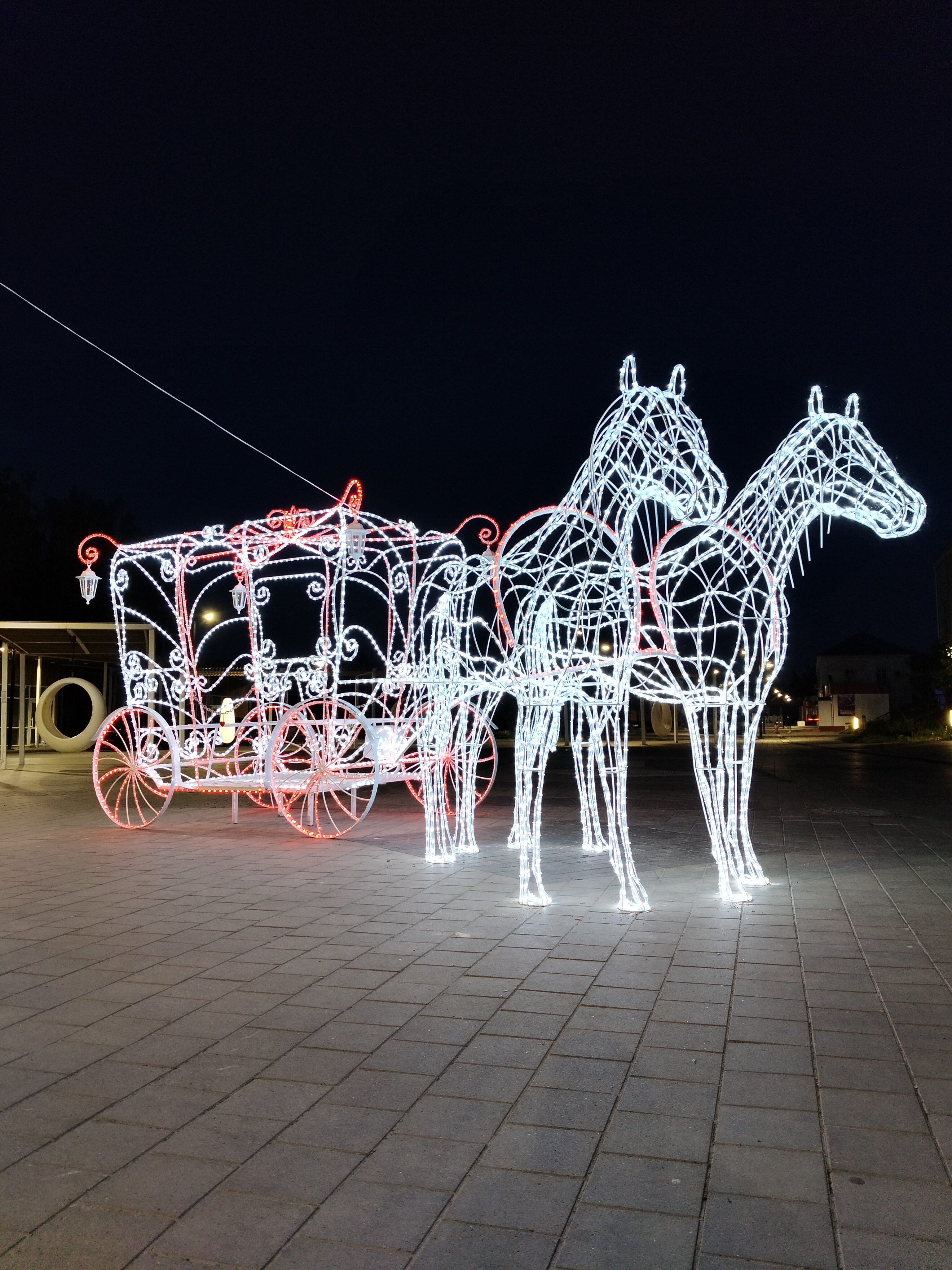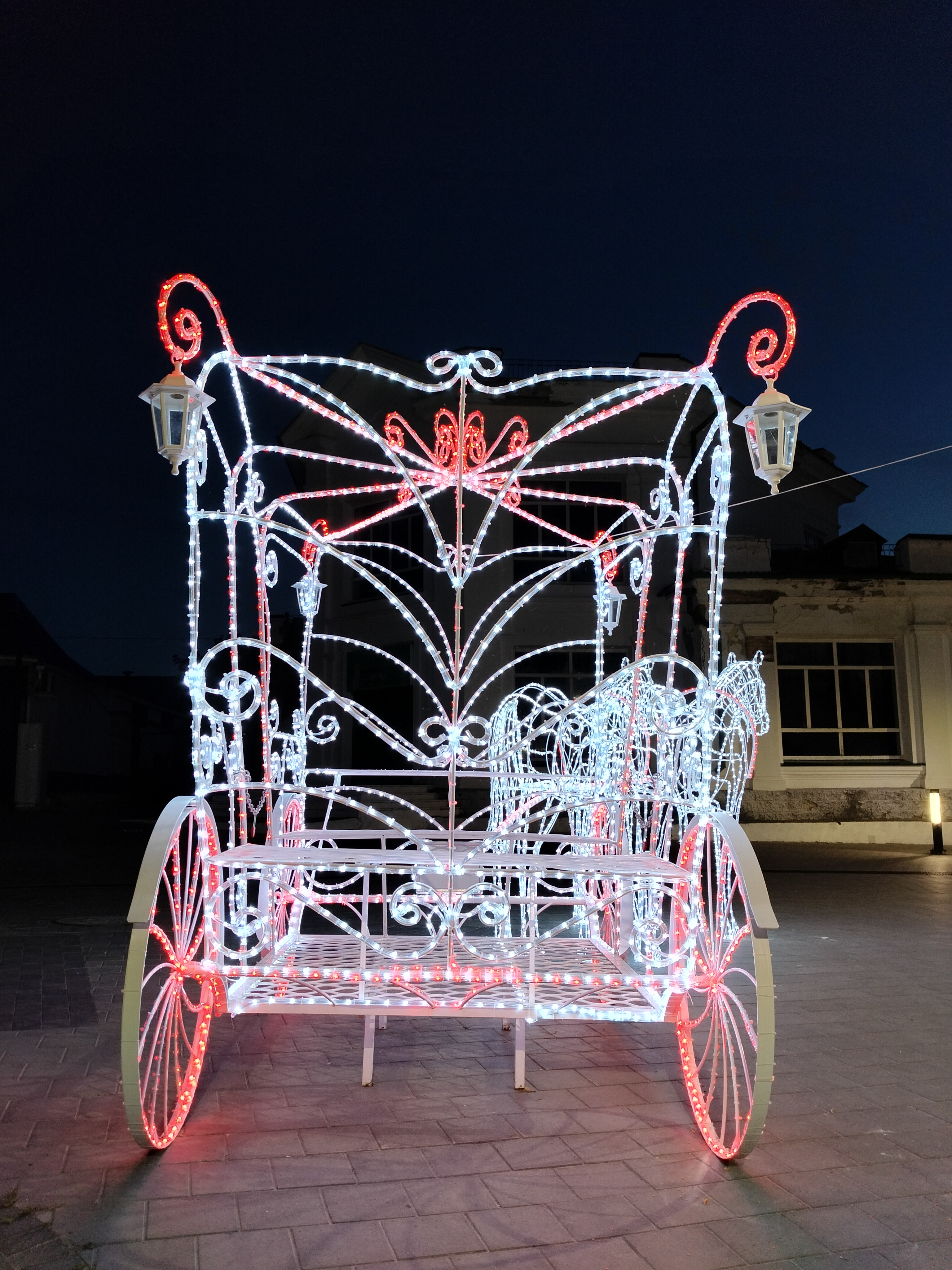 Композиция в натуральную величину. Высота кареты 240см,длина 260см,ширина 160см. Кони - высота 200см, общая длина композиции 6,3 метра. Каркас кареты сделан из арматуры 8мм и 10мм, украшен холодно кованными элементами. Окрашен порошковой краской. Световой декор обсуждается отдельно.
