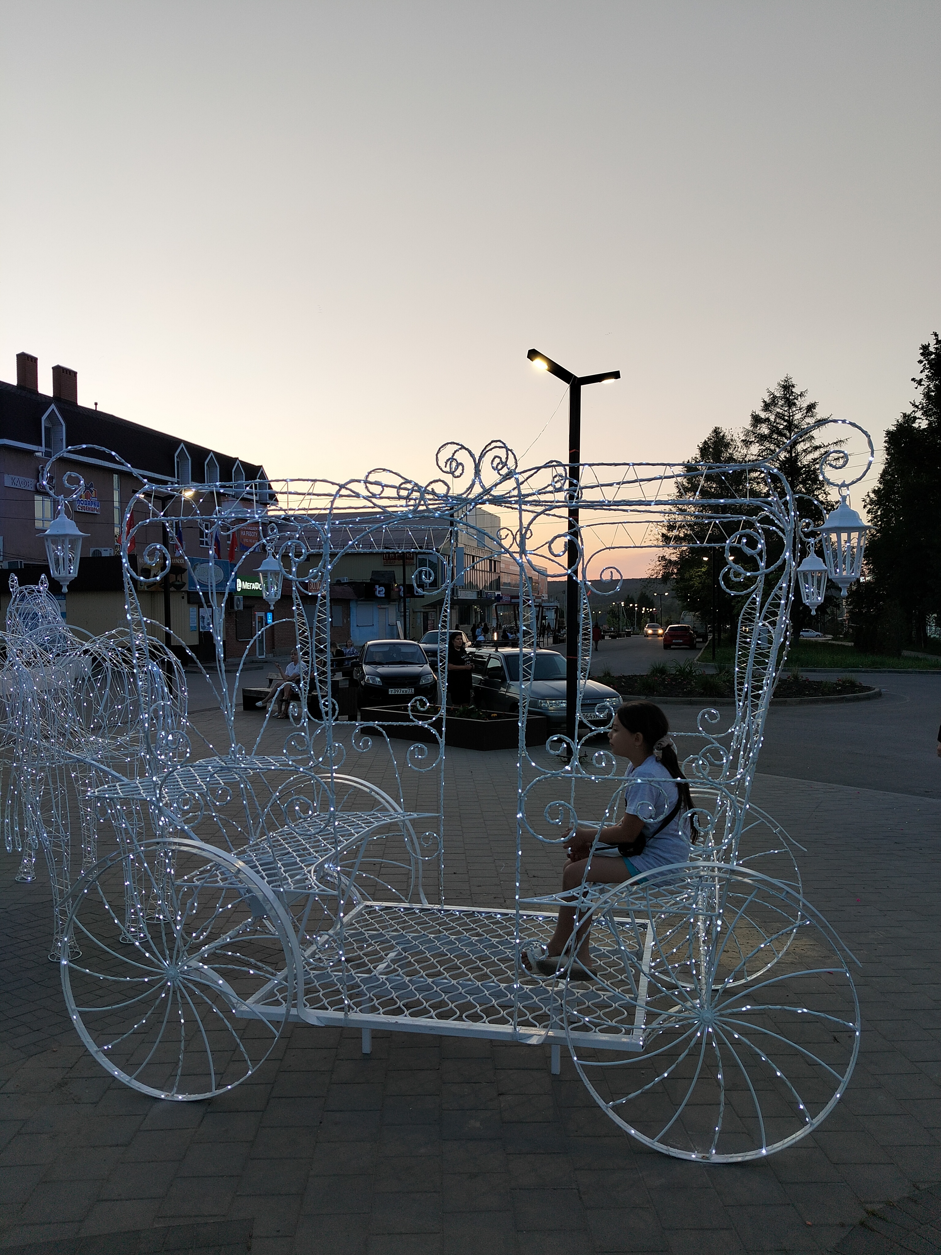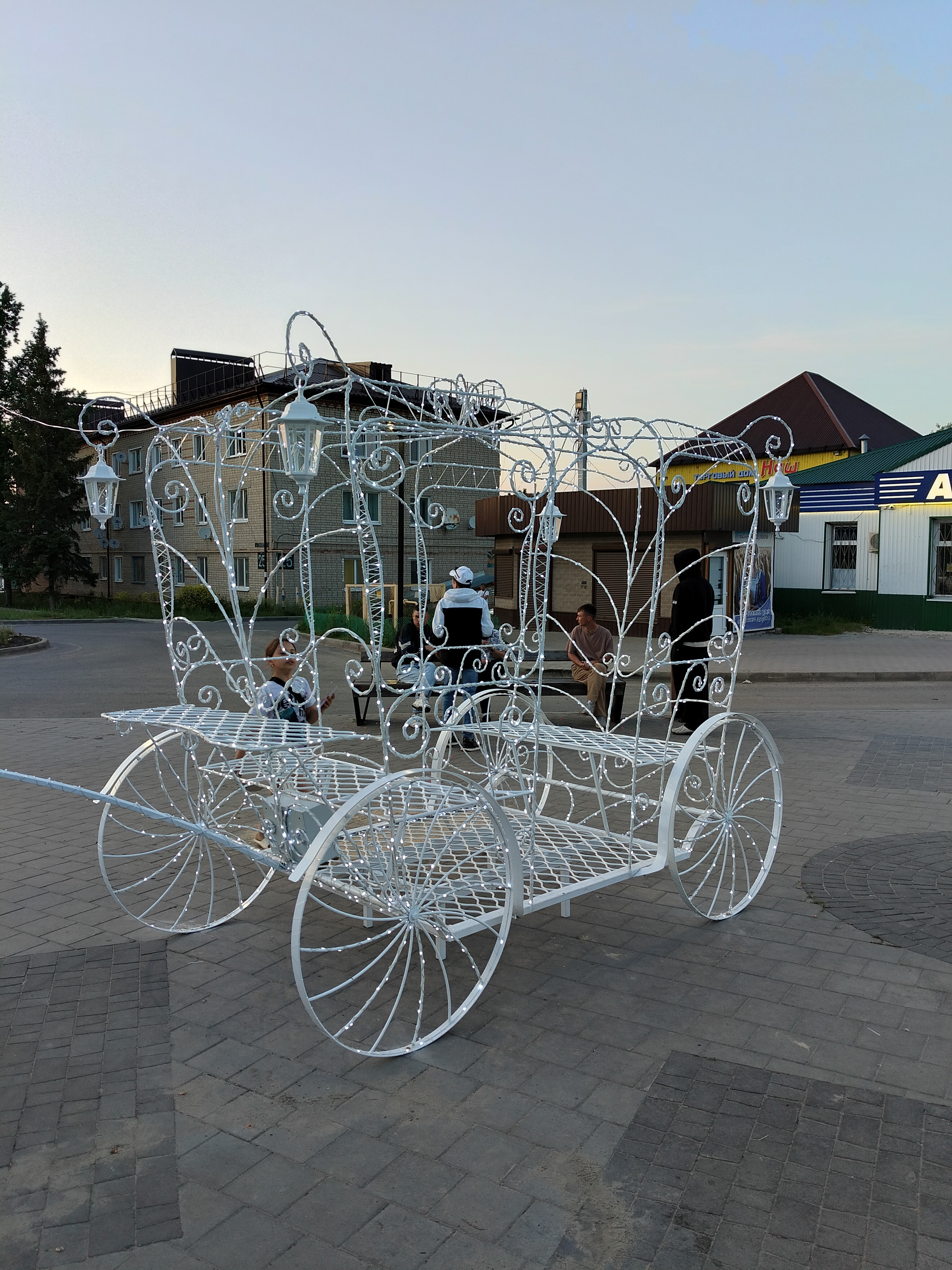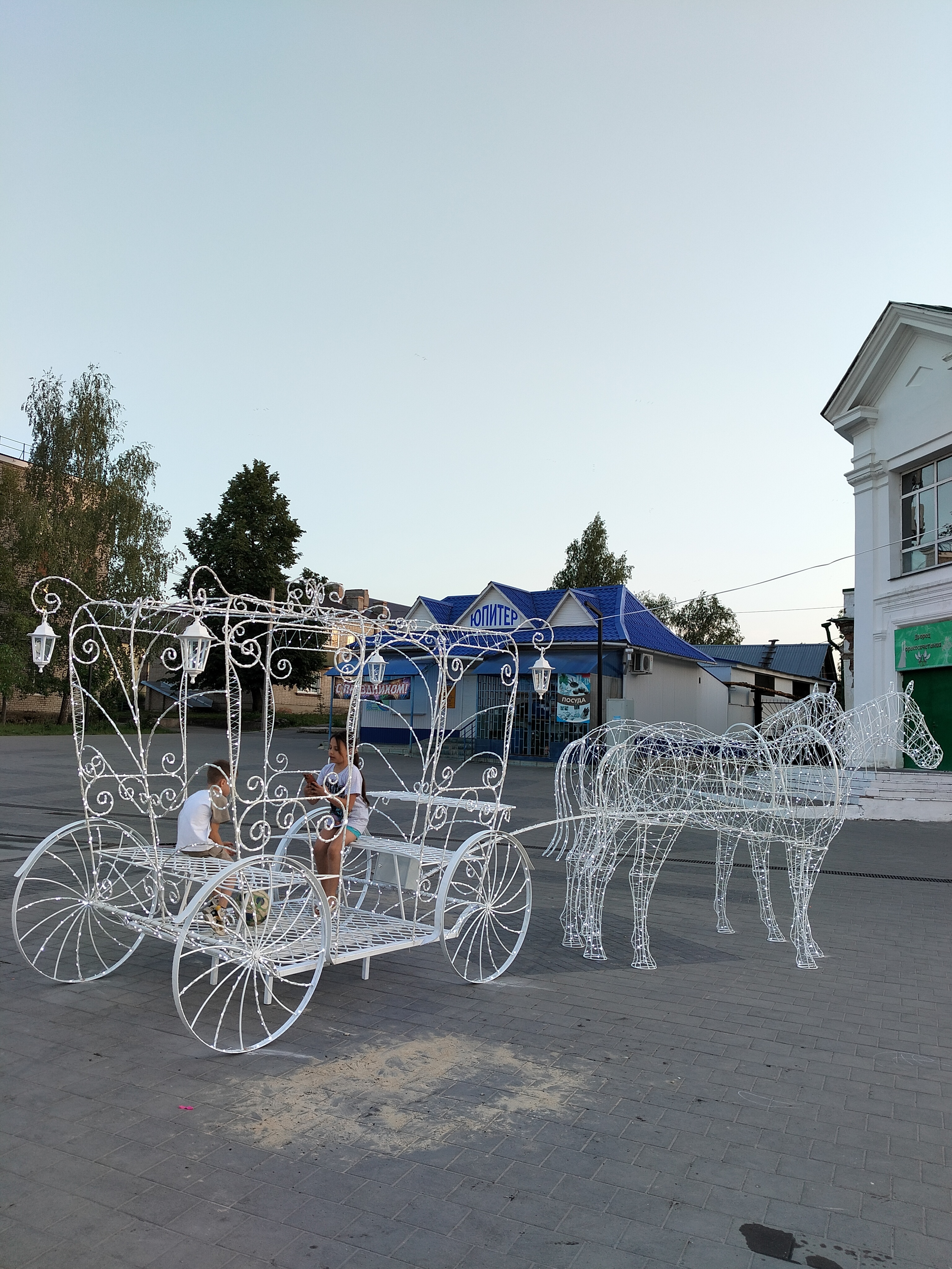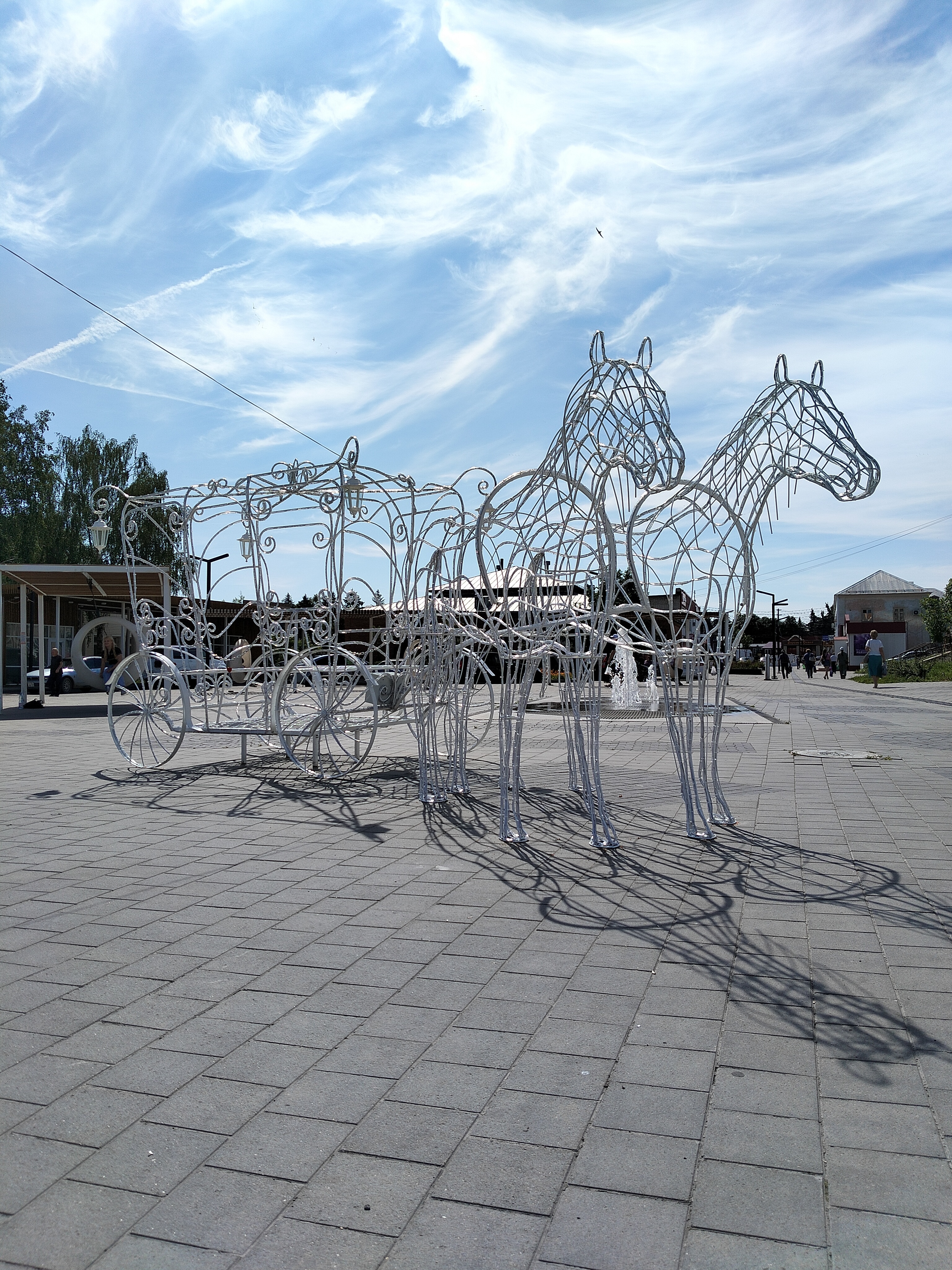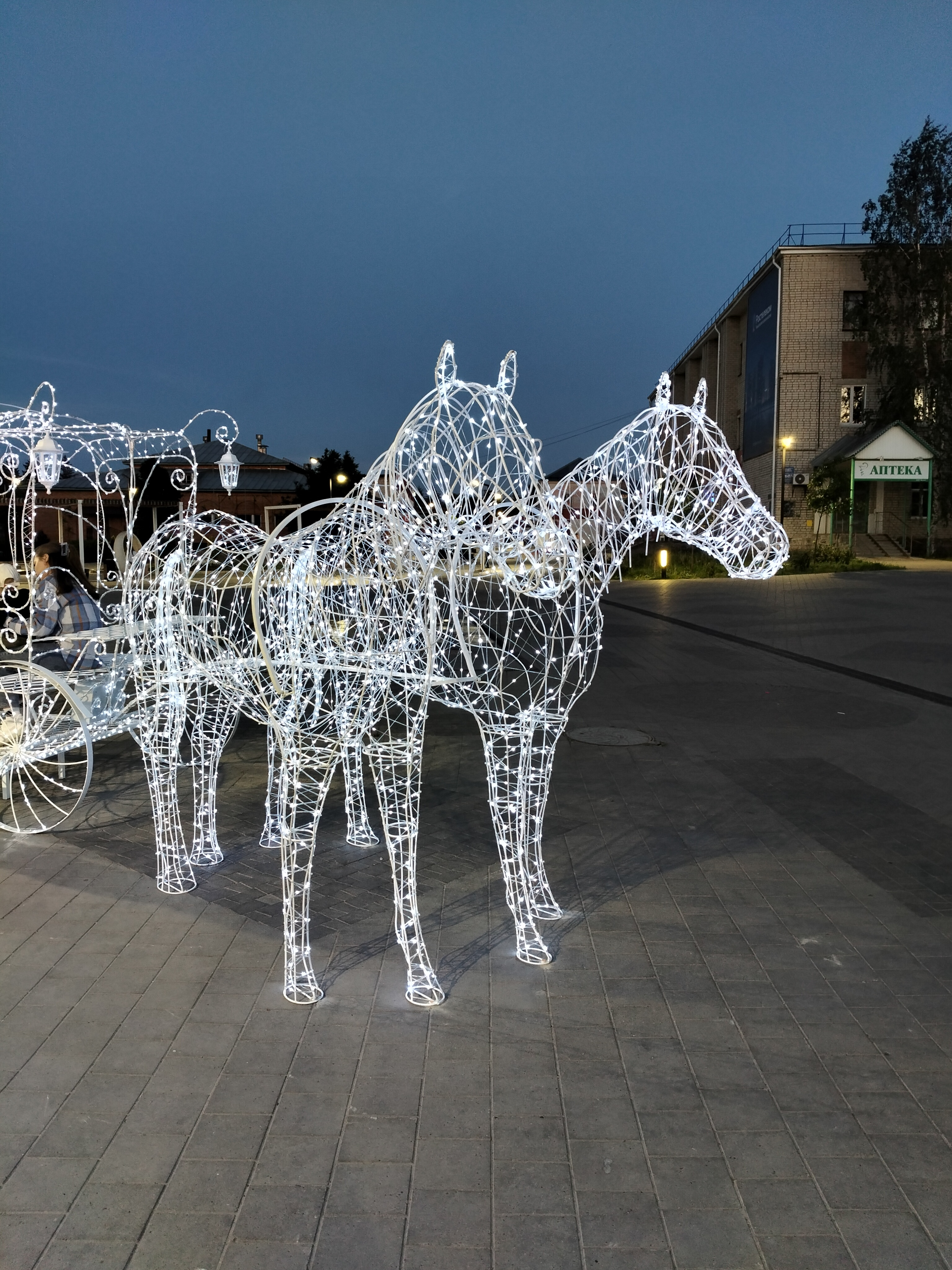Композиция в натуральную величину. Высота кареты 240см,длина 260см,ширина 160см. Кони - высота 200см, общая длина композиции 6,3 метра. Каркас кареты сделан из арматуры 8мм и 10мм, украшен холодно кованными элементами. Окрашен порошковой краской. Световой декор обсуждается отдельно.